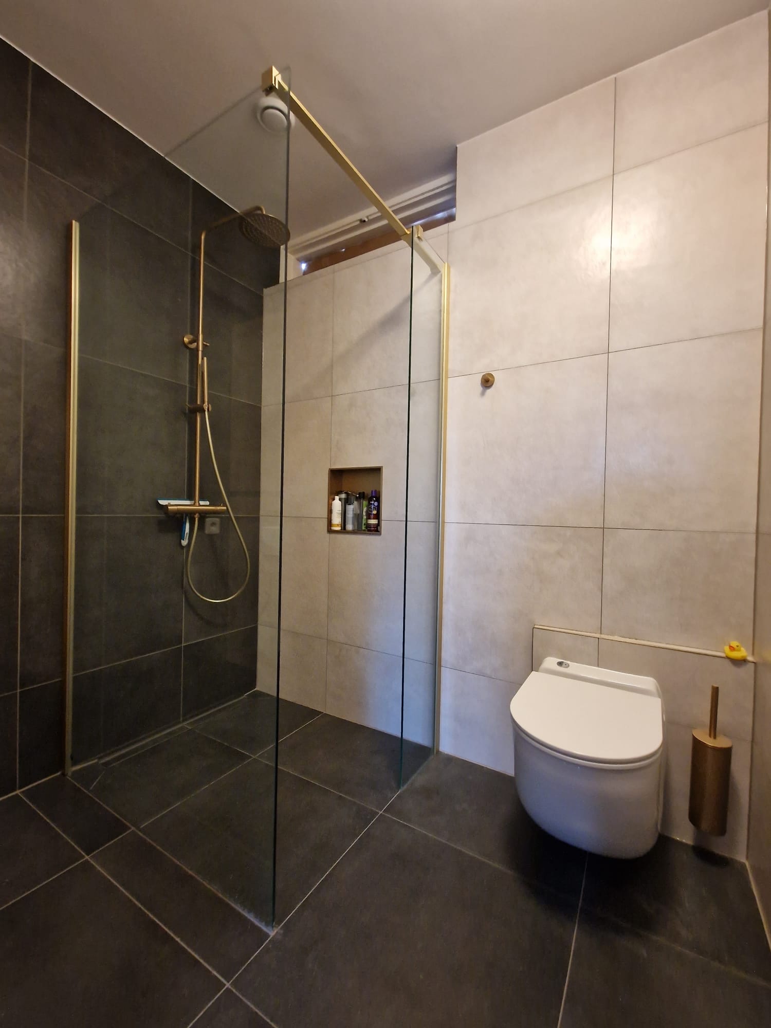 Mix van Mat & GoudEen stijlvolle badkamer waar contrasten elkaar perfect aanvullen. De grote, matzwarte vloertegels en donkere wand in de douche vormen een krachtig contrast met de lichte wanden en het warme eiken wastafelmeubel. Goudkleurige kranen en accessoires voegen een exclusieve touch toe. De minimalistische inloopdouche met glazen wand en het zwevende toilet houden de ruimte luchtig, terwijl de ronde spiegel en praktische nisjes zorgen voor zachte accenten in dit strakke ontwerp.